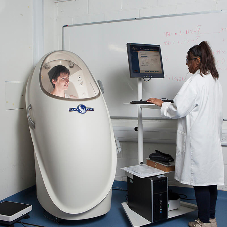 - We also have a BodPod which measures the proportion of total fat mass and lean body mass represents an individual's body composition.